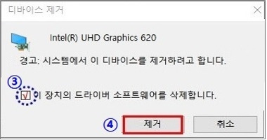 ③ [이 장치의 드라이버 소프트웨어를 삭제합니다] 항목에 V 체크 후 제거를 클릭하세요.