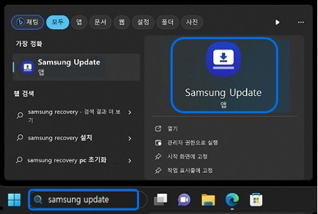 1) 키보드에서 Windows 로고 키 + Q 키를 누른 후 검색창에 Samsung Update를 입력한 후 검색된 Samsung Update 앱을 실행하세요.