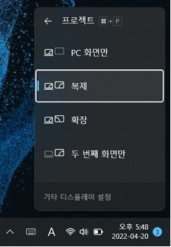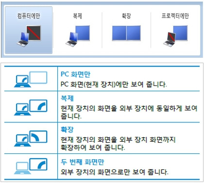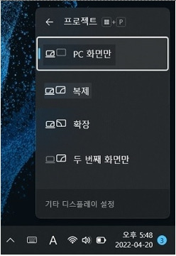 키보드에서 Windows 로고 키 + P 키를 눌러 디스플레이 설정 화면이 나오면 원하는 모드로 선택합니다.