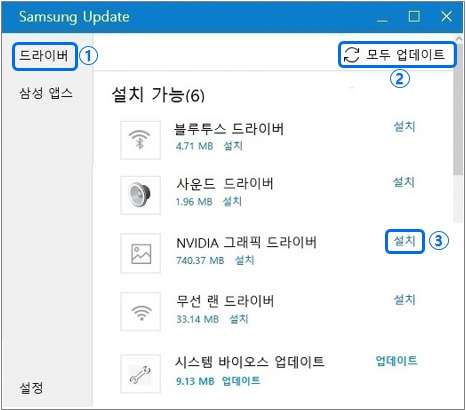 2. Samsung Update를 통한 장치 드라이버 재설치