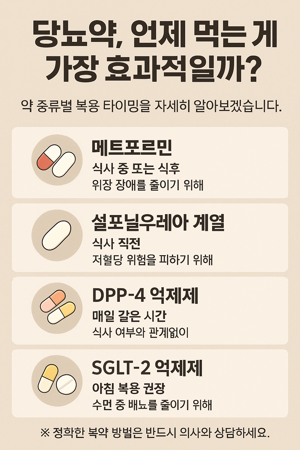 당뇨병은 ‘혈당 조절’이 치료의 핵심입니다. 많은 분들이 식단이나 운동만큼이나 중요한 것이 바로 약물 복용이라는 사실을 간과하곤 합니다. 특히 약을 먹는 ‘시간’과 ‘방법’이 잘못되면, 약효가 떨어지거나 심할 경우 저혈당 같은 위험한 상황이 생기기도 합니다.