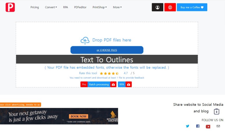 첨부가 완료되면 아래 처럼 뜨고요. 오른쪽 빨간 원의 'Text to Outlines' 를 클릭하시면 됩니다. 광고가 좀 있으니 잘 살펴보셔야 해요. 무료니까 그려러니.