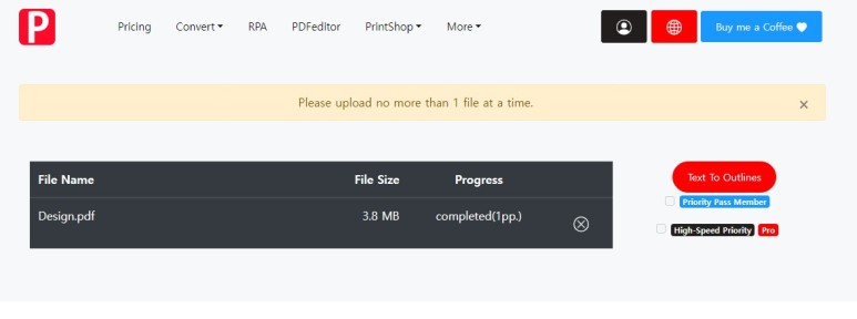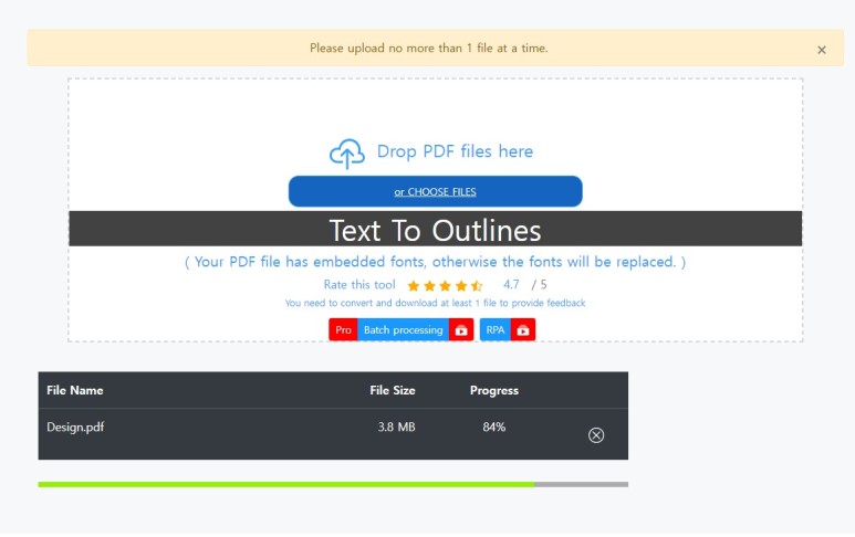 이렇게 전환환 PDF 화일을 올리려고 하면 또 다시 텍스트 아웃라인이 정리 되지 않았다는 메세지가 뜨는 경우가 있어요. 디자인을 모르는 저 같은 사람들은 이게 무슨 말인가 싶은데요 한마디로 텍스트가 인쇄 중에 깨질 염려가 있으니 손질해서 올려달라는 거랍니다. 깨져도 좋다! 라고 생각해도 올려 지지 않으니 반드시 택스트 아웃라인을 정리 해 주어야 해요. 이게 무슨 소리인지 알아야 정리고 뭐고 할텐데 저처럼 고민하지 마시고 다음의 사이트로 가면 자동으로 정리 됩니다. 물론 무료 입니다.
