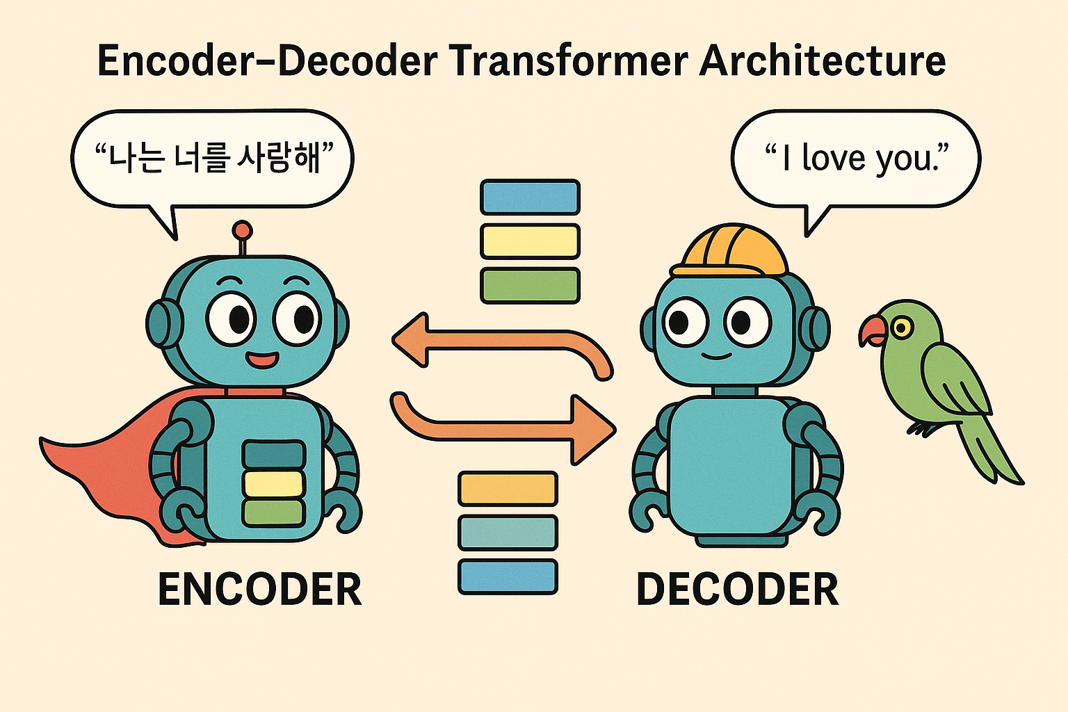 사람처럼 말하고 글을 쓰는 AI, 예를 들어 ChatGPT나 번역기(Papago, DeepL)가 어떻게 말을 배울 수 있을까요? 그 비밀은 바로 인코더–디코더(Encoder–Decoder) 구조와 그 구조를 똑똑하게 만든 트랜스포머(Transformer) 아키텍처에 있습니다.