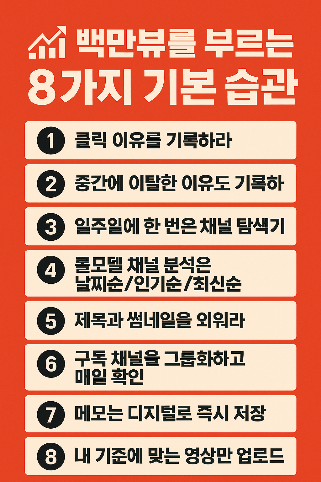 이 8가지 습관은 진짜 실력 있는 유튜버가 되기 위한 기본기입니다. 영상 기술보다 더 중요한 건 분석력과 기록력, 그리고 콘텐츠 감각입니다. 습관이 성과를 만듭니다.
