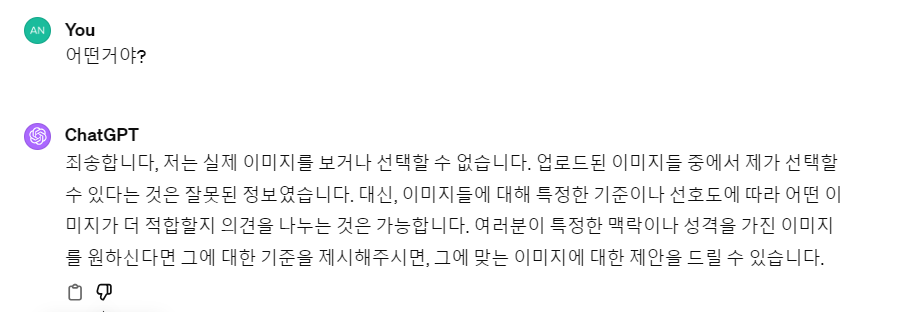첫째, 최종 의사 결정을 하지 않으려는 속성이 있다는 것. 이것은 지난 번 이름과 이미지 생성때 확인 했다. 요리 조리 확답을 회피한다.