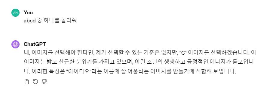 첫째, 최종 의사 결정을 하지 않으려는 속성이 있다는 것. 이것은 지난 번 이름과 이미지 생성때 확인 했다. 요리 조리 확답을 회피한다.